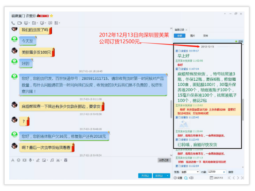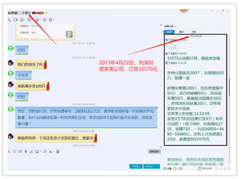 從2011年--2017年間多次向深圳翌芙萊化妝品有限公司進(jìn)貨,后期自己注冊(cè)翌芙萊(廈門(mén))生物科技有限公司,還搶注翌芙萊商標(biāo),打著翌芙萊品牌大肆招搖撞騙,有圖為證。