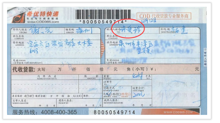 許愛(ài)珍快遞發(fā)貨單記錄