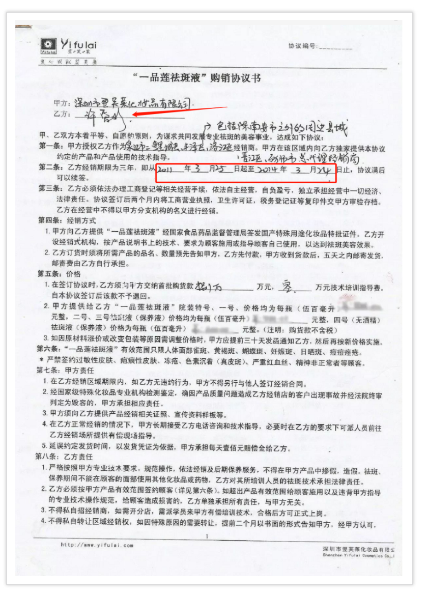 此公司全稱為翌芙萊(廈門(mén))生物科技有限公司,法人代表許愛(ài)珍,許愛(ài)珍于2011年3月25日簽約翌芙萊購(gòu)銷(xiāo)協(xié)議,為深圳翌芙萊化妝品有限公司經(jīng)銷(xiāo)商。