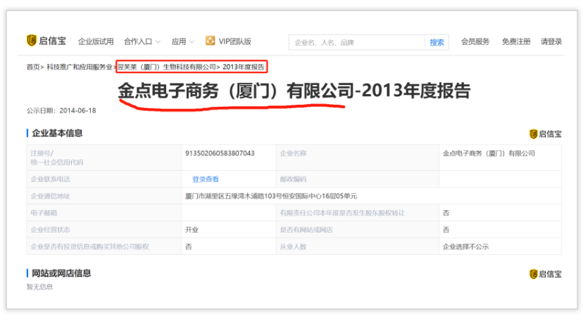 更可笑的是,在2014年的企業(yè)年報(bào)顯示,這家廈門(mén)翌芙萊的公司前生是一家叫做:金點(diǎn)電子商務(wù)(廈門(mén))有限公司,可想而知做了兩年加盟商后就開(kāi)始策劃走假冒品牌的路子。